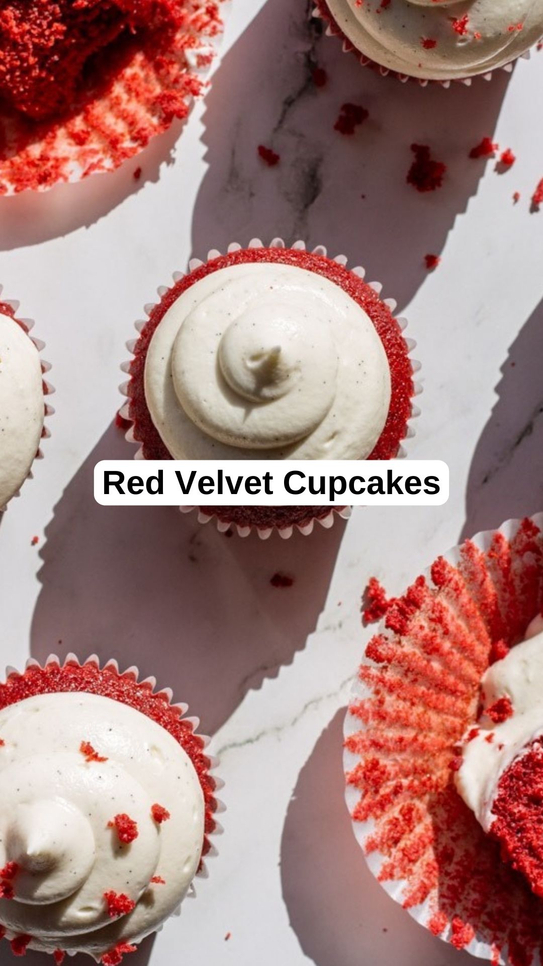 These red velvet cupcakes are a family favorite, using the same cake base our mom has been baking for over 30 years. The buttermilk cake has a hint of cocoa and the classic red color thanks to a bit of food dye. They’re topped with a creamy vanilla bean cream cheese frosting.