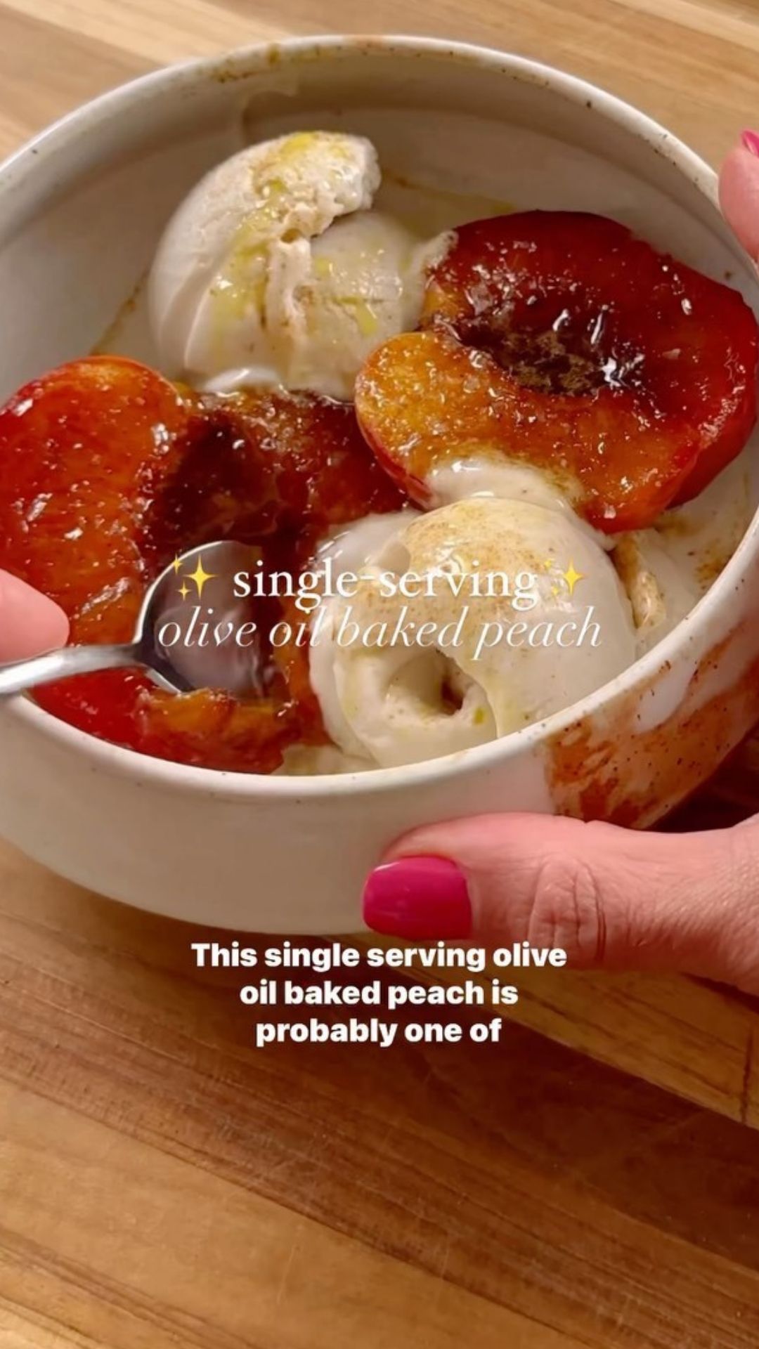 - Once done, let the peach cool for a bit, then top it with a scoop of vanilla ice cream and a drizzle of olive oil if you like. Serve it up and enjoy your sweet summer treat!